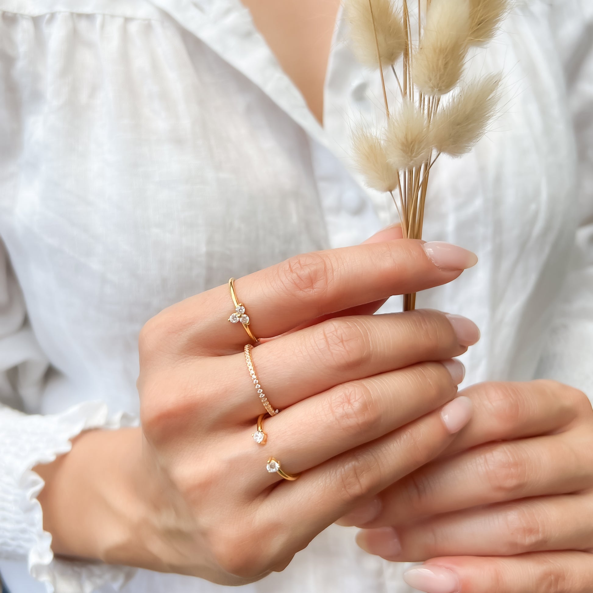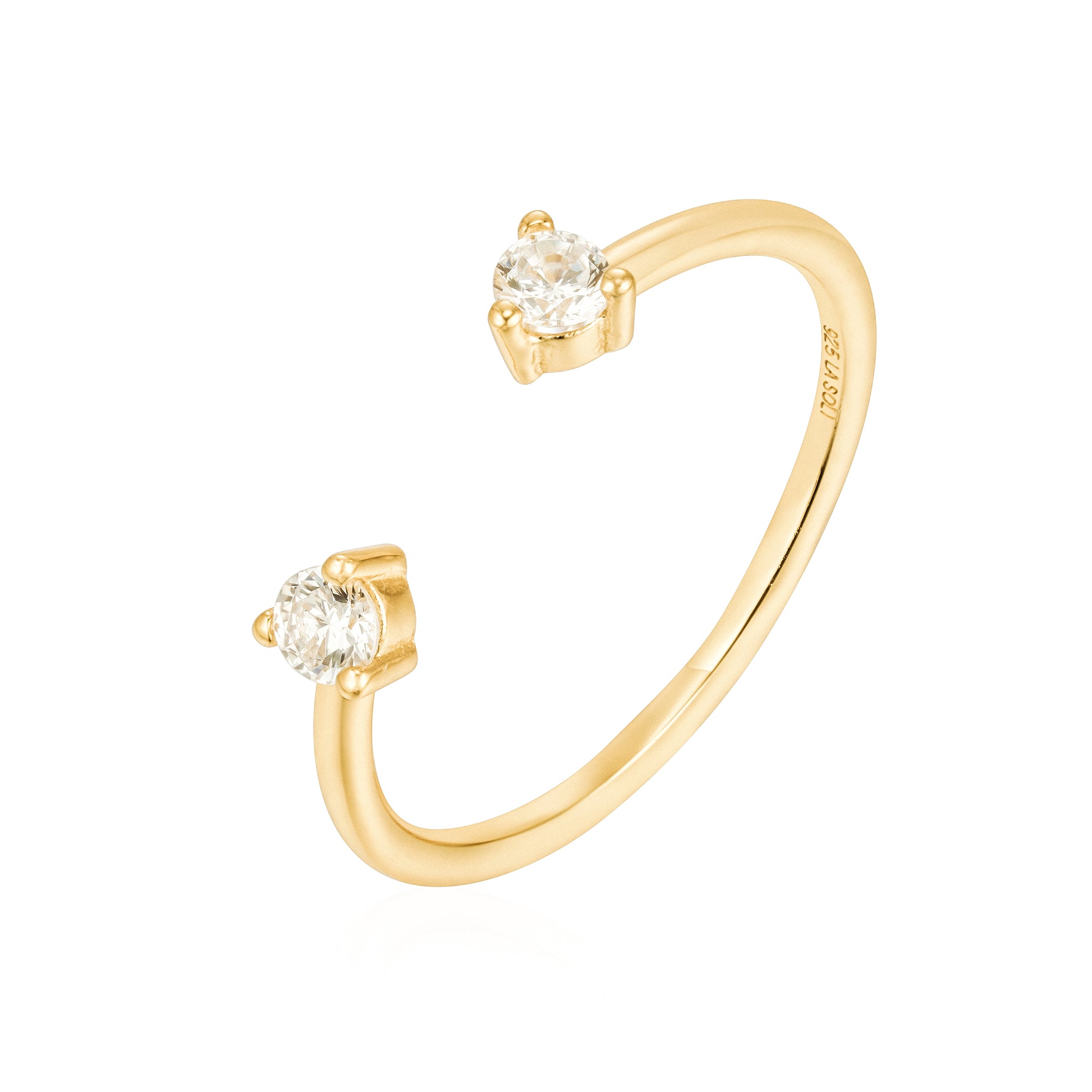 Add a touch of sparkle to your everyday with our beautiful Andrea Ring. This ring features an open band with two matching prong-set cubic zirconia stones on each end of the band. Designed to be stacked together or worn on its own, your options are endless for wearing it your own style.