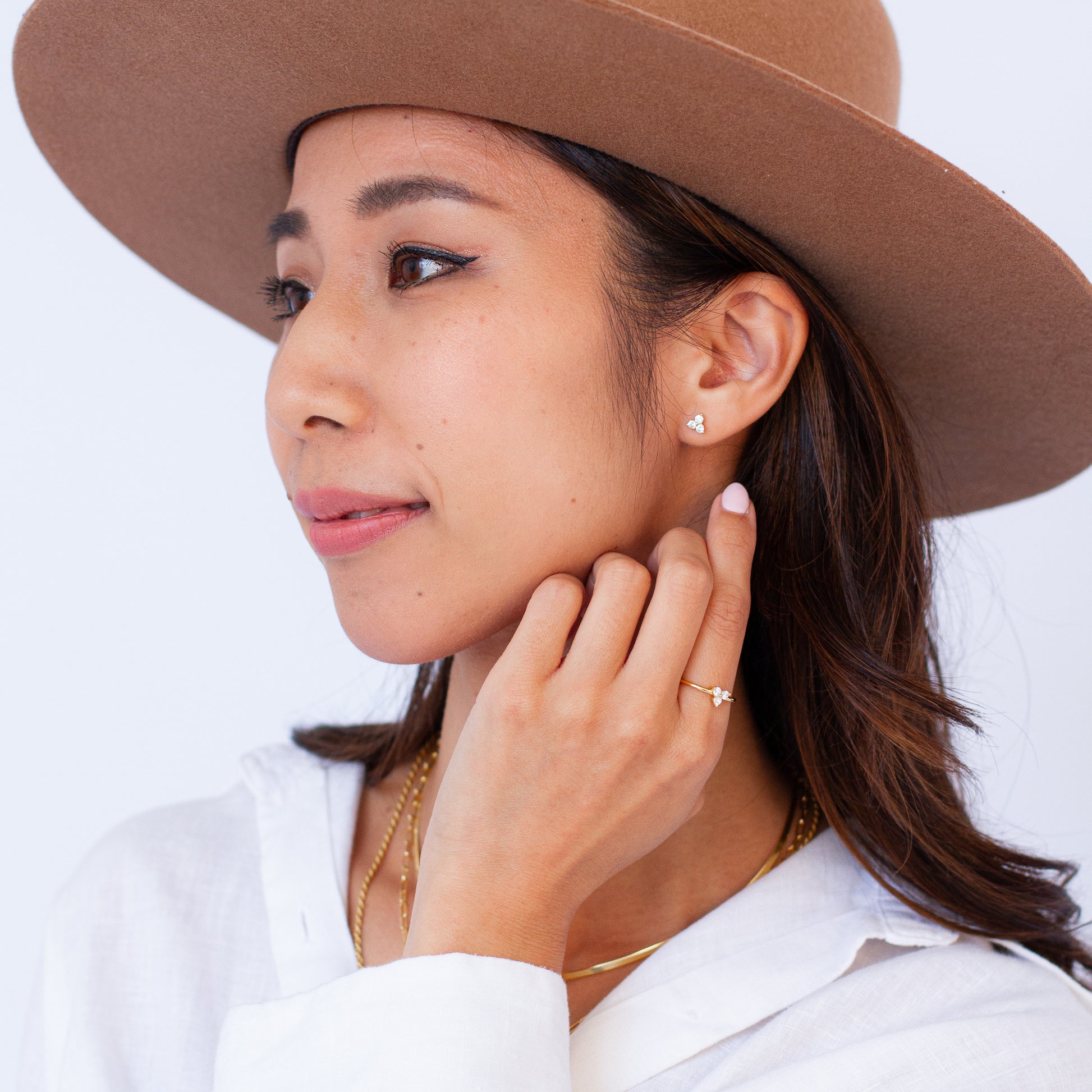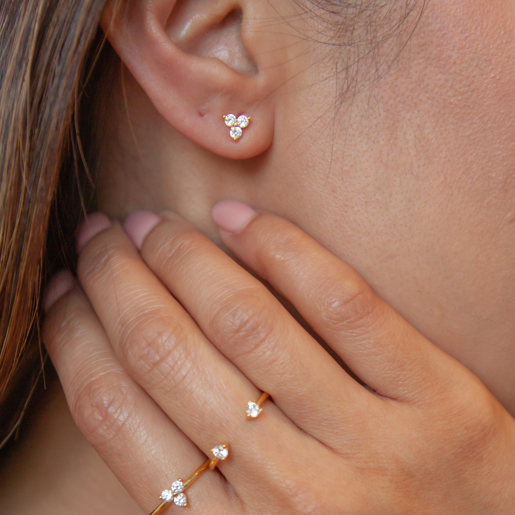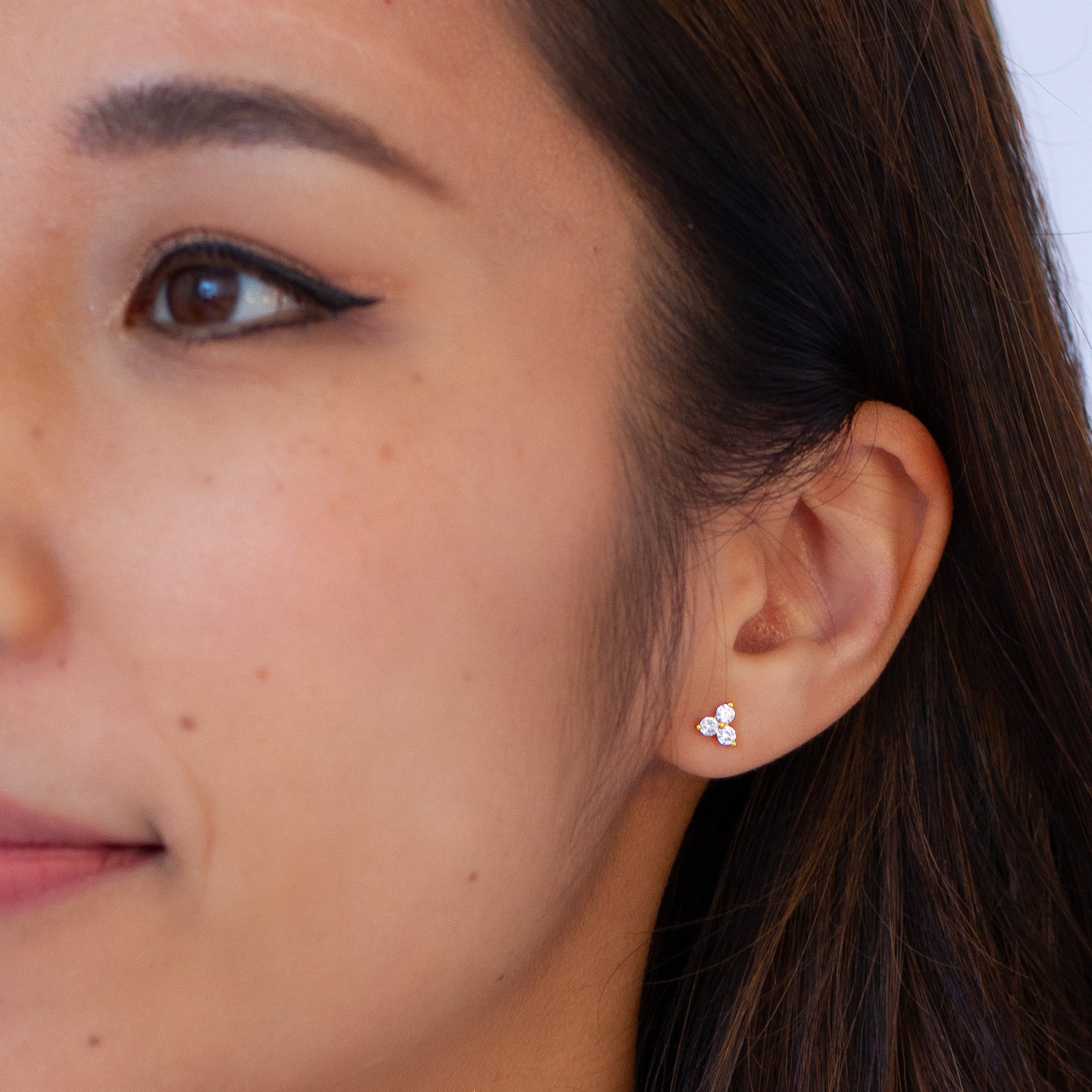Make your every day a little brighter with our Trinity Stud Earrings. Featuring a trio of white cubic zirconia stones and a butterfly stud closure. This earring is perfect for ever day. Wear it on its own or dazzle within an earring stack.
